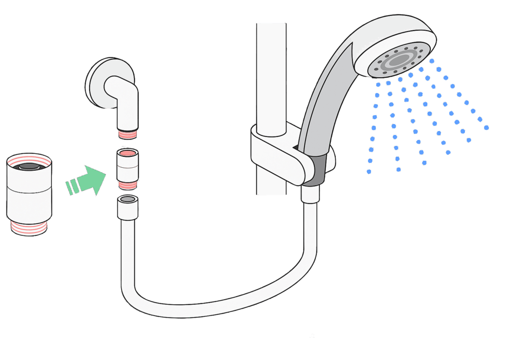 -> Am Duschschlauch wird der Ökoflow®-Strahlreglers zwischen Armatur und Schlauch eingesetzt.